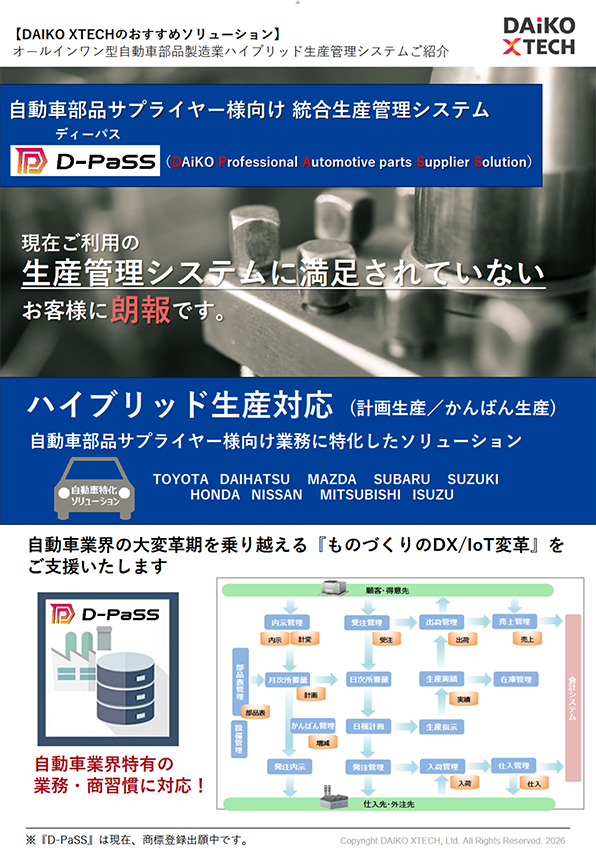 「かんばん」や「号口/補給/廃止」といった業界特有の業務・商習慣に対応した機能を標準装備した、自動車部品サプライヤー向け生産管理システム。